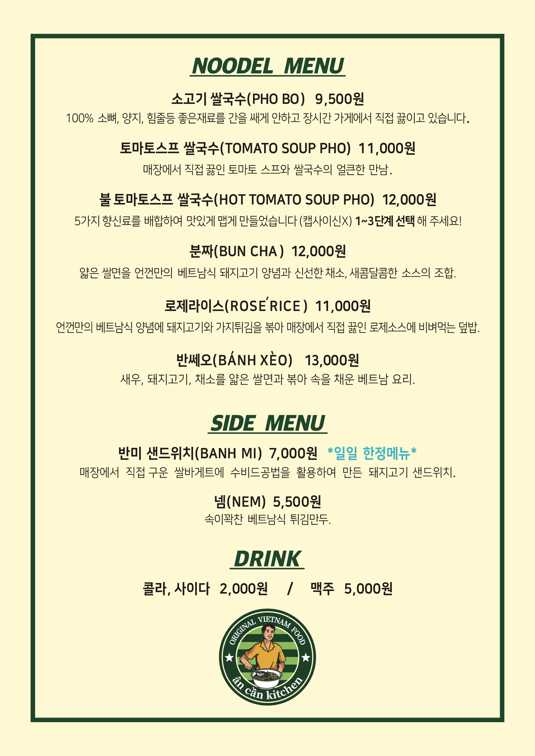 월남쌈 5,000 | 껌승 11,000 | 소고기 쌀국수(Pho Bo) 9,500 | 토마토스프 쌀국수(Tomato Soup Pho){ 11,000 | 불토마토스프쌀국수 12,000 | 분짜(Bun Cha) 12,000 | 넴(Nem) 5,500 | 반미 샌드위치(Banh Mi) 8,000 | 로제라이스(ROSE RICE) 11,000 | 반쎄오 13,000