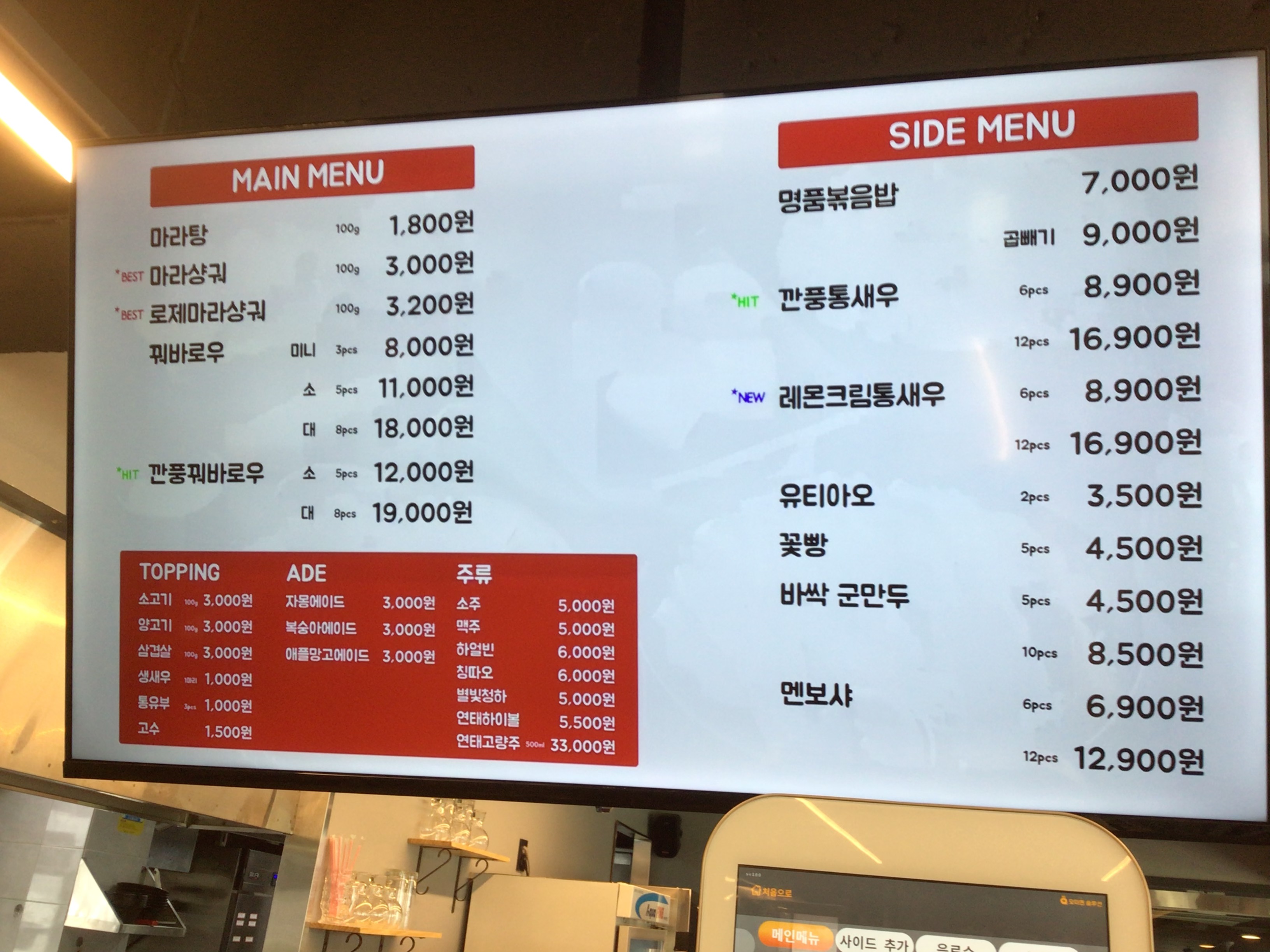 마라탕/100g 2,200 | 마라샹궈/100g 3,800 | 마라반/100g 2,600 | 양고기 토핑/100g 3,500 | 소고기 토핑/100g 3,500 | 량피 7,000 | 미니전(오리지날) 2,500 | 미니전(딸기) 3,000 | 미니전(마요네즈) 3,000 | 미니전(매운) 3,000 | 미니전(치즈) 3,500 | 미니전(계란) 3,500